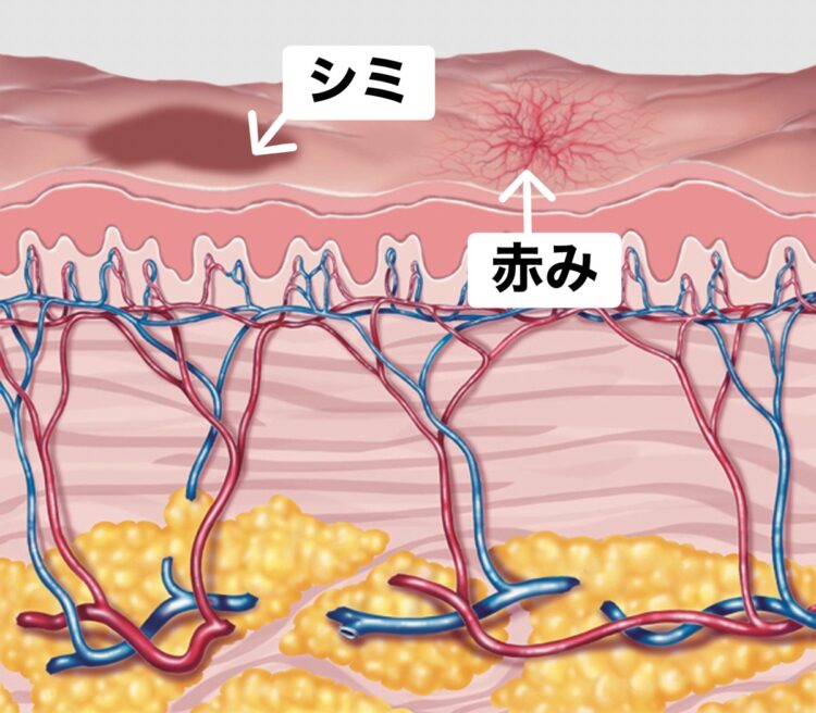 年齢とともに新陳代謝が衰えることで肌のターンオーバーの速度が落ち、真皮に存在するコラーゲンなどの量やまたそれを作り出す力も減ってしまいます。紫外線などによって傷ついたケラチノサイトの中に、メラニンを多く持つものが現れ、シミやソバカスができてきます。
